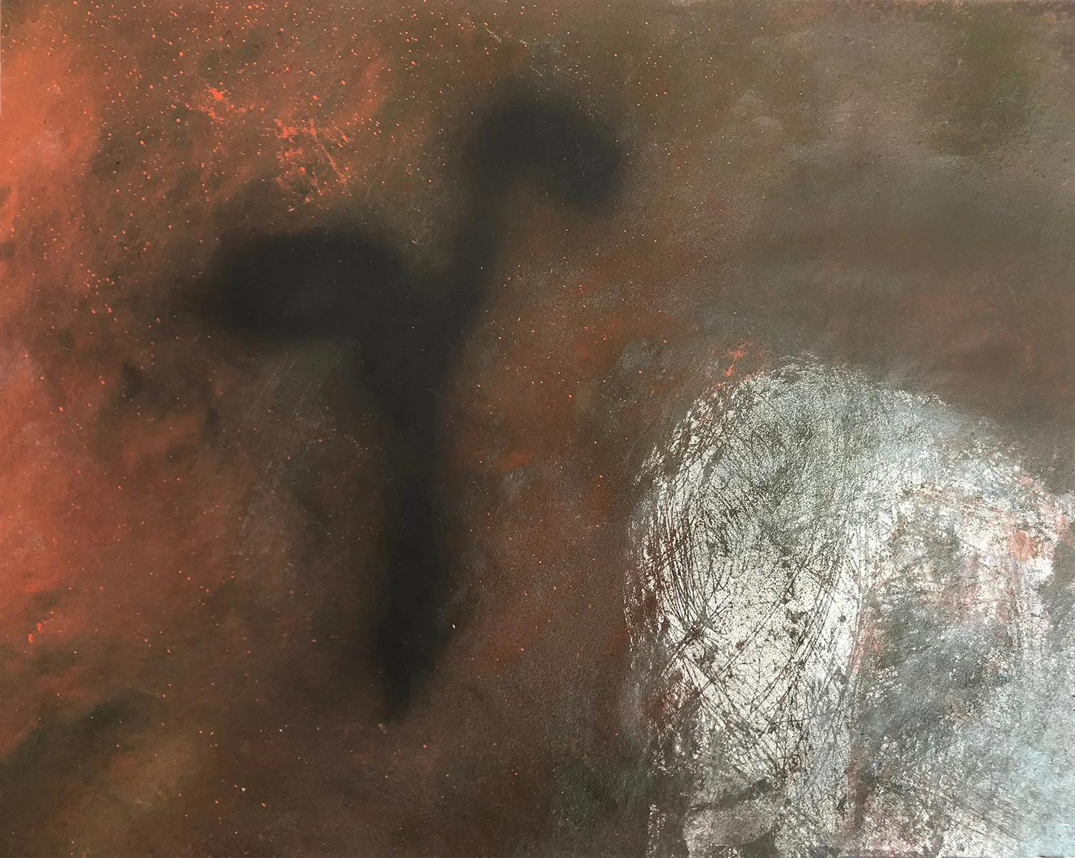 In these drawings from 2018, I begin with spray paint, laying down the dimension where inchoate thoughts reside. Then, using white transfer paper (like carbon paper, but white), I inscribe images that float above or in front of the void. The drawings are of microcosm and macrocosm, of interiority and the larger world.
